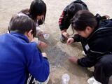 3年生は図工「土をかんじて」で校庭の土を容器に集めました。場所を変えながら土を集めていくと、「ここは茶色がこいよ!」「こっちは白っぽい!」と、いろいろなちがいに気づく子どもたち。集めた土を容器に入れていくと、まるで地層のようにきれいな層ができました。手でさわった感触や見た目のちがいを楽しみながら、土のひみつをたくさん発見することができました。