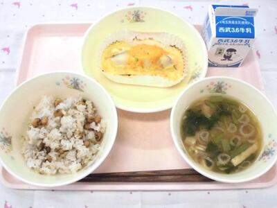 明日、11月8日は「いい歯の日」です。給食では、歯の健康を考えてよくかんで食べる献立にしました。カリカリ大豆ごはんは、乾燥大豆をかためにゆでて、カリっとした食感になるように油で揚げました。揚げた大豆にたれを絡めて、ご飯に混ぜています。よくかまないと食べられないかたさになっていたので、いつもよりたくさんかんで食べてくれたはずです。