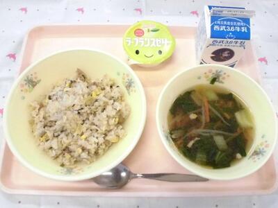 11月11日(火) 投稿: 池田小管理者 (11/11) しゃくしなチャーハン はるさめスープ ラ・フランスゼリー 牛乳 11月は彩の国ふるさと学校給食月間なので、埼玉県の食材や料理が給食に登場します。今日は、秩父地方で作られているしゃくし菜の漬物を使ったチャーハンを作りました。もう一品は、春雨スープです。春雨スープには野菜がたくさん使われていますが、春雨が好きな人が多いのか、いつも人気があります。しゃくし菜チャーハンもよく食べてくれて、どの料理も残りがほんの少しでした。 -