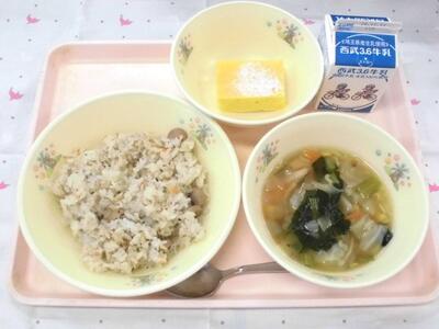 ウインナーピラフは、鶏ガラスープでごはんを炊き、ウインナーと野菜を炒めた具を混ぜて作りました。ABCスープは、野菜スープにアルファベットマカロニを入れただけなのですが、とても人気があります。にんじんケーキは、すりおろしたにんじんをケーキの生地に混ぜて焼きました。全体がきれいな薄オレンジ色になりました。にんじんの味は気にならないので、苦手な人でも食べやすいと思います。