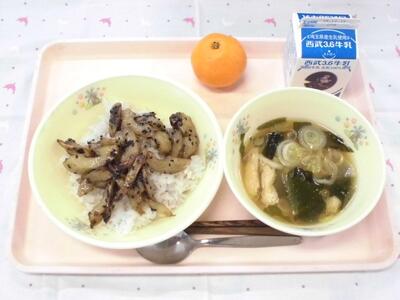 ちくわとごぼうのごまだれ丼は、蒸したちくわと揚げたごぼうに、黒ゴマたっぷりのたれを絡めてご飯にのせて食べる料理です。昨年度、作り方をいろいろと改良して、良い感じのレシピができあがったものです。ちくわもごぼうも、かむ回数が多めの食べ物ですが、みなさんはよくかんで食べられたでしょうか。