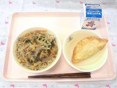 今日の献立は、どちらも人気メニューです。しょうゆラーメンのスープは、豚骨と煮干しでだしをとり、お肉と野菜のうまみたっぷりです。前は鶏がらと豚骨でだしをとっていましたが、前に喜多方ラーメン風のしょうゆラーメンを作ろうとしたときに、豚骨と煮干しでだしをとってみたらとてもおいしかった、ということがありました。それからしょうゆラーメンは豚骨と煮干しでだしをとることにしています。3年1組の教室では、「いただきます」をして一口目にラーメンを食べて、「おいしい!」「うまい!」とつぶやいている人が多かったです。