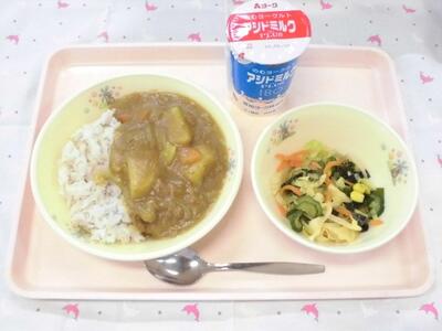 今日は、カレーの日にちなんでカレーライスを作りました。社団法人全国学校栄養士協議会が、学校給食週間の前のこの日に給食でカレーを提供するよう呼びかけたのがきっかけで制定されたそうです。全国の学校給食で、どのくらいの学校が今日カレーを食べていたのか気になりますね。池田小では、見た目はいつものカレーですが、普段小麦粉を使って手作りしているルーを、今回は米粉を使って作りました。普段と変わらず喫食率(提供した量のうち、食べた量の割合)が99%を超えていましたので、ほっとしました。これからもおいしいカレーをみんなにたくさん食べてもらいたいです。