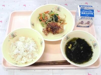 今日は韓国料理風献立です。ヤンニョムチキンは、揚げた鶏肉に甘辛いたれを絡めて作りました。前に作ったとき、たれが全体にかからなかったので、今回はクラス分の揚げた鶏肉を数えた後に、たれをよく絡めてから食缶に入れてくれました。このひと手間で、全体に味がついてさらにおいしくなりました。ありがとうございます。
