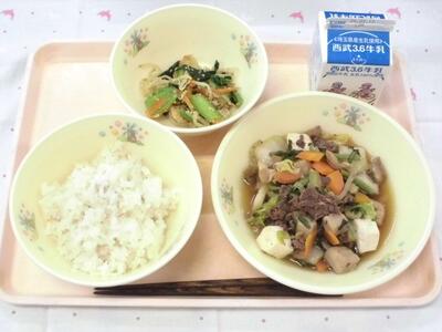 おかずは、すき焼き煮です。お肉と野菜、豆腐などを甘辛い味付けで煮こみました。ご飯と一緒に食べるおかずですが、ちょっと量が多かったので食べきれなかったクラスもあったようです。次に作るときは少し調整しようと思います。