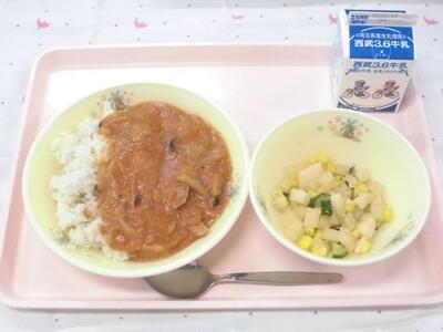 今日は、豚肉と玉ねぎたっぷりのハッシュドポークをご飯にかけて食べました。具材は豚肉と玉ねぎがメインですが、きのこも合うのでぶなしめじを入れました。きのこが苦手な人もいると思いますが、ほとんど残りがありませんでした。たくさん食べてもらえてうれしいです。だいコーンサラダは、大根とコーンがたっぷりのサラダです。コーンに合わせて、他の野菜をコロコロとした形に切ってもらいました。いつものサラダと見た目が違って楽しんでもらえたのではないかと思います。給食室のみなさん、丁寧な作業ありがとうございました。