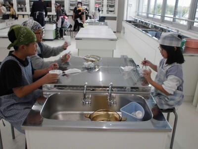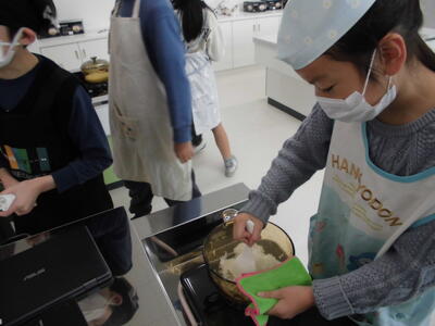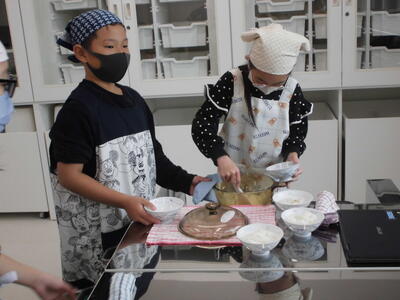 11月7日(金) 5年生 家庭科「食べて元気に」炊飯調理実習 投稿: 池田小管理者 (17:01) 家庭科で米を鍋で炊飯する調理実習を行いました。 普段炊飯器で炊いているお米。炊飯器の中でどのような変化が起きているのか、ガラス鍋を使って様子を観察しながら実習をしました。 水を吸って膨らむ様子や、大粒の泡が勢いよく吹く様子に驚きながら炊き上がりを待ち、炊き立てのご飯をおいしくいただきました。 ぜひ家庭でもチャレンジしてほしいです。 -