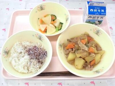 4月23日(木) 投稿: ルーム管理者 (17:35) 麦ごはん しらすのごまふりかけ 肉じゃが そくせきづけ 牛乳 今日は品数が多い献立でした。ふりかけは蒸したしらす干し、ゆかり、煎ったごまを混ぜて作りました。肉じゃがはいつも人気があるメニューです。毎回、じゃがいもが煮えているけど崩れない、絶妙の加減で、味も染みていておいしいです。今回も安定のおいしさでした。 即席づけは、時々給食に出ますが、今回はかぶとかぶの葉を使いました。味わって食べてもらえたでしょうか。 -