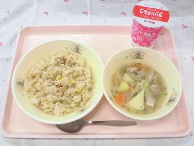 4月27日(月) 投稿: ルーム管理者 (14:06) キャロットピラフ ぶた肉とキャベツのスープ煮 のむヨーグルト 今日は、洋風の献立です。キャロットピラフは、にんじんをたくさん使って作りました。また、とりガラスープでごはんを炊いて、うま味たっぷりのピラフに仕上げました。2品と飲むヨーグルトの献立だったので、1品あたりの量が結構多かったのですが、よく食べてくれました。低学年も、おかわりをする子がたくさんいます。 -